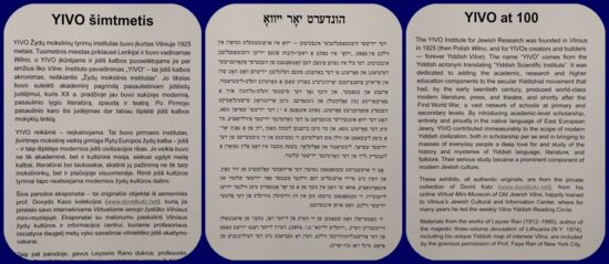 Introduction (in Yiddish, Lithuanian, and English) to the exhibit honoring Yivo’s centennial at Vilnius’s Jewish Cultural and Information Center in the heart of the city’s Old Town