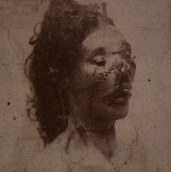 Mortuary photograph of Catherine Eddowes, a victim of Jack the Ripper. Original photograph in collection of Royal London Hospital Archives and Museum, catalog number MC/PM/5/2/5. Public domain.