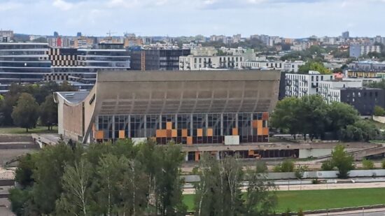 The brutalist Soviet sports legacy as it stands today in Šnipiškės on the right bank of the Neris River, desecrating the Old Jewish Cemetery.