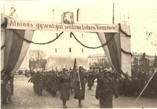 Lithuanian soldiers symbolically entering Vilnius by marching through Katedros aikštė to take control in 1939. Credit: personal album of Kęstutis Makariūnas, nuclear physicist and former chairman of the Lithuanian Science Council. Accessed online.