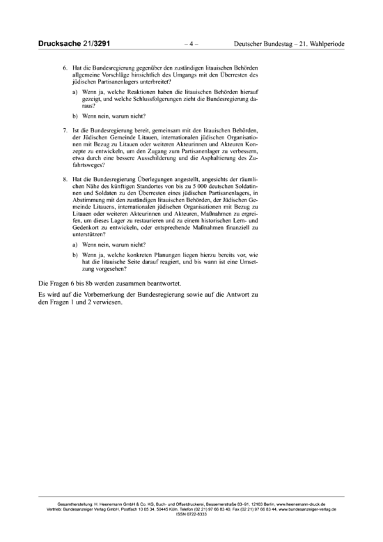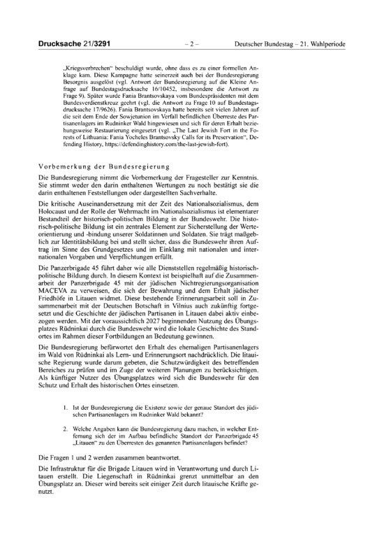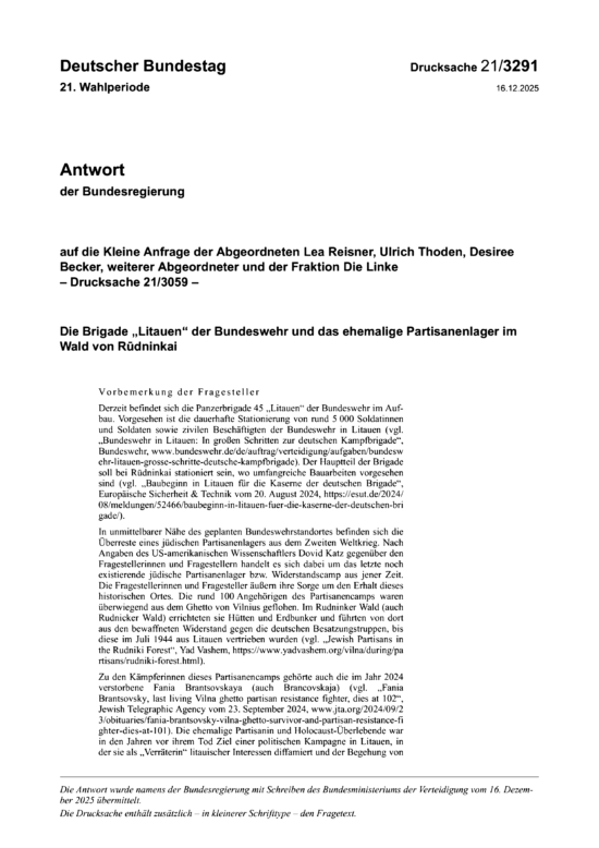 BERLIN—The German Bundestag’s 16 December 2025 record of questions-and-answers on the remnants of the last Jewish partisan fort in Lithuania, is now online on the German parliamentary website and available as separate PDF. Images of the individual pages follows: